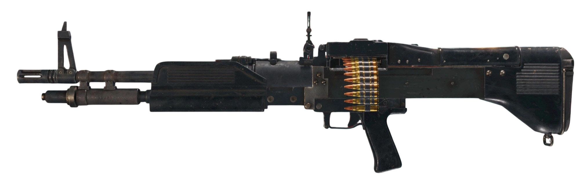 - Также является не ручным, а единым пулемётом. То есть предназначен для установки на станки, транспорт, и стрельбы с разложенных сошек.