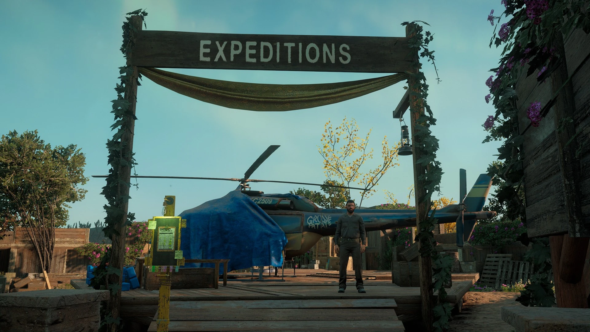 The Expeditions-section of Prosperity allows you to travel to remote locations outside post-apocalyptic Hope County. Roger Cadoret flies you in his Helicopter La Gross Patate to several highly fortified Highwaymen-Outposts. Upgrading the facility unlocks different fast travel options.