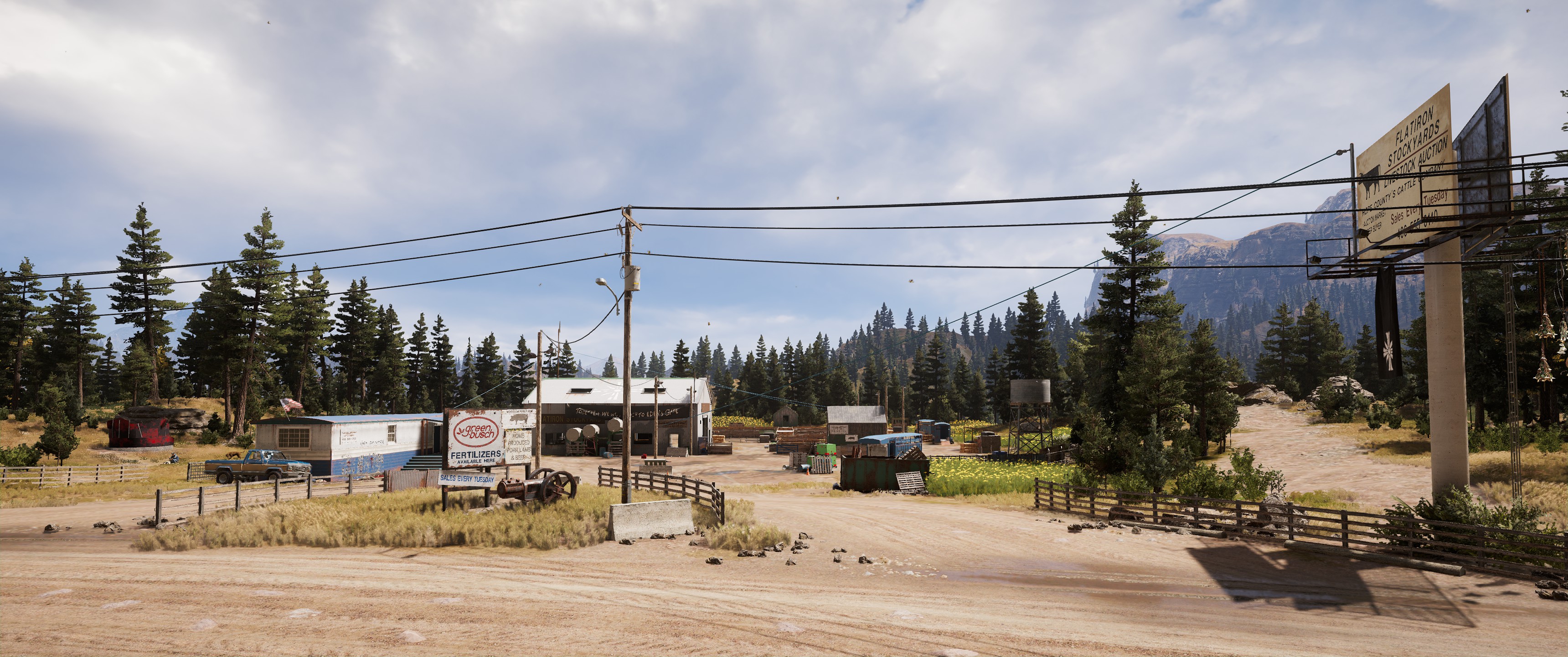 The Flatiron Stockyards is a location in the Holland Valley region of Hope County in Far Cry 5. It is located directly east of Woodson Pig Farm, northwest of the Fillmore Residence, and south of the Grain Elevator.