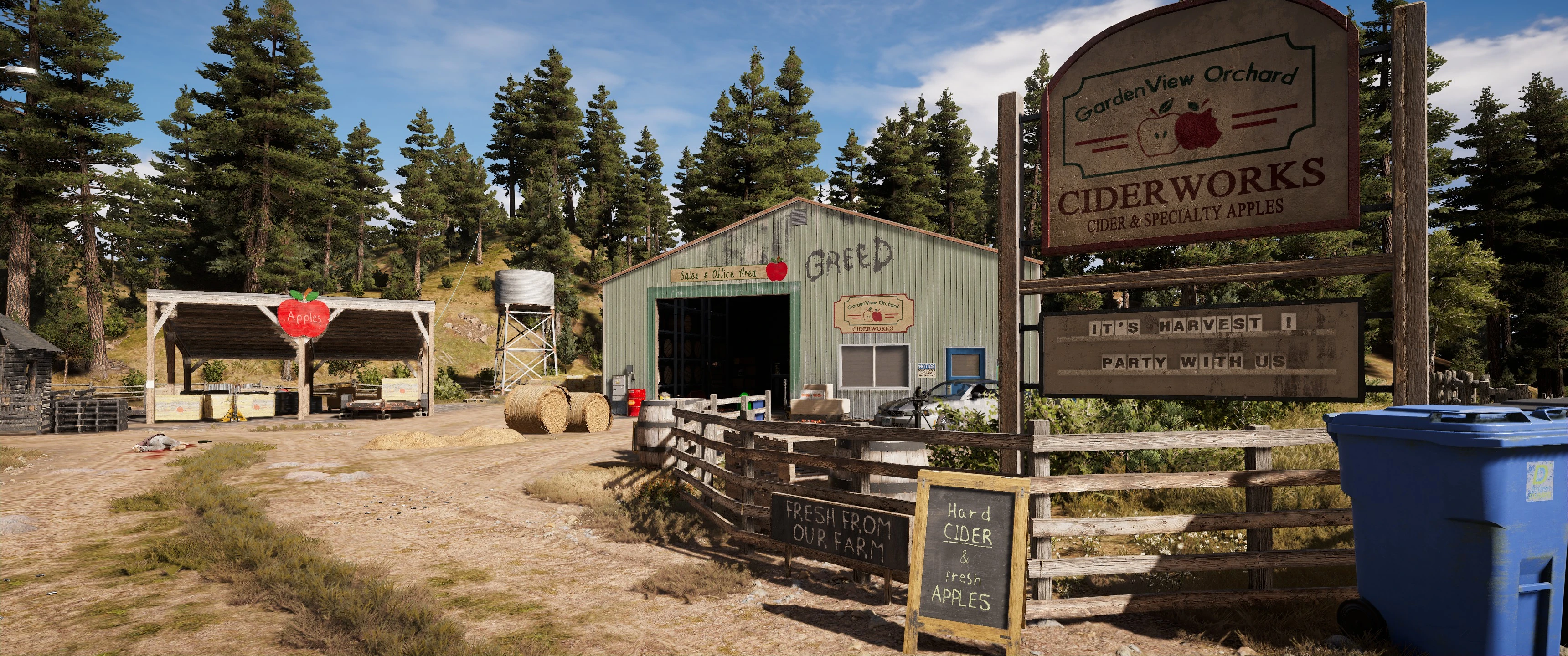 Gardenview Ciderworks is a location in the Holland Valley region of Hope County in Far Cry 5. It is located due south of Gardenview Packing Facility and Rae-Rae's Pumpkin Farm, east of the Howard Cabin, west of Sergey's Place, northeast of Strickland Farm, and northwest of the Copperhead Rail Yard.