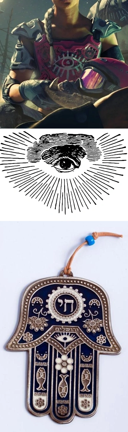 - A Hamsa amulet often features an eye at the centre of its palm, and sometimes the eye is surrounded by outward lines. One of its most popular uses is the warding off of the evil eye. If this is the case, the Highwaymen's choice reveals a pervading superstition, grounded in a symbol that predates the fall of the bombs.