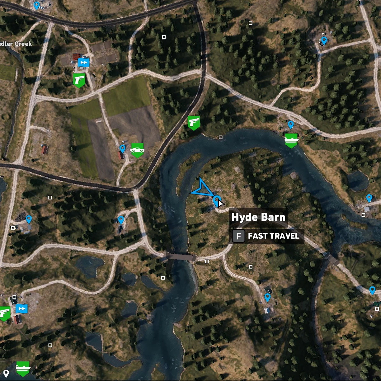 The Hyde Barn is a location in the Holland Valley region of Hope County in Far Cry 5. It is North of the Adams Ranch, East of the Redler Residence, and directly Southeast of Sunrise Threshing.