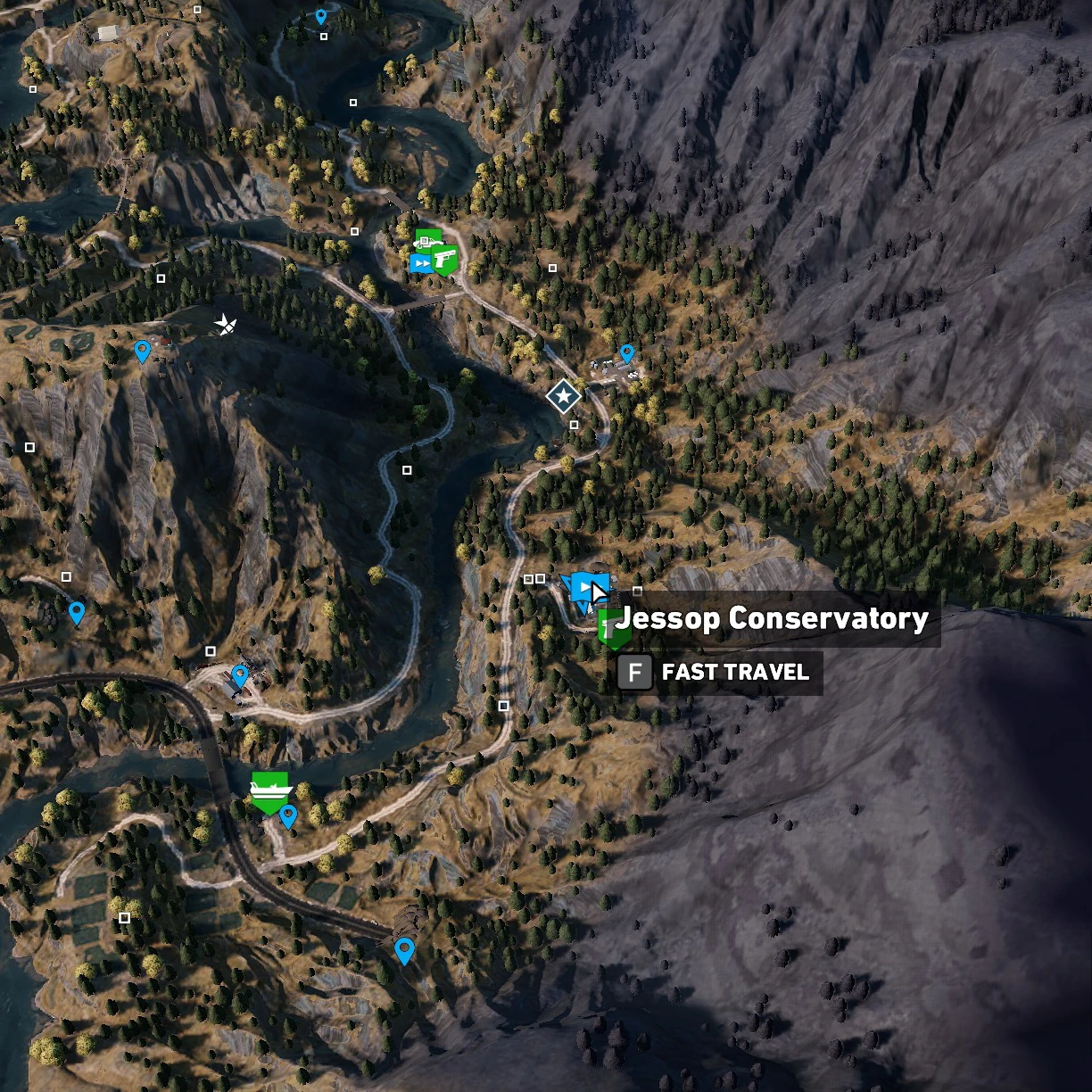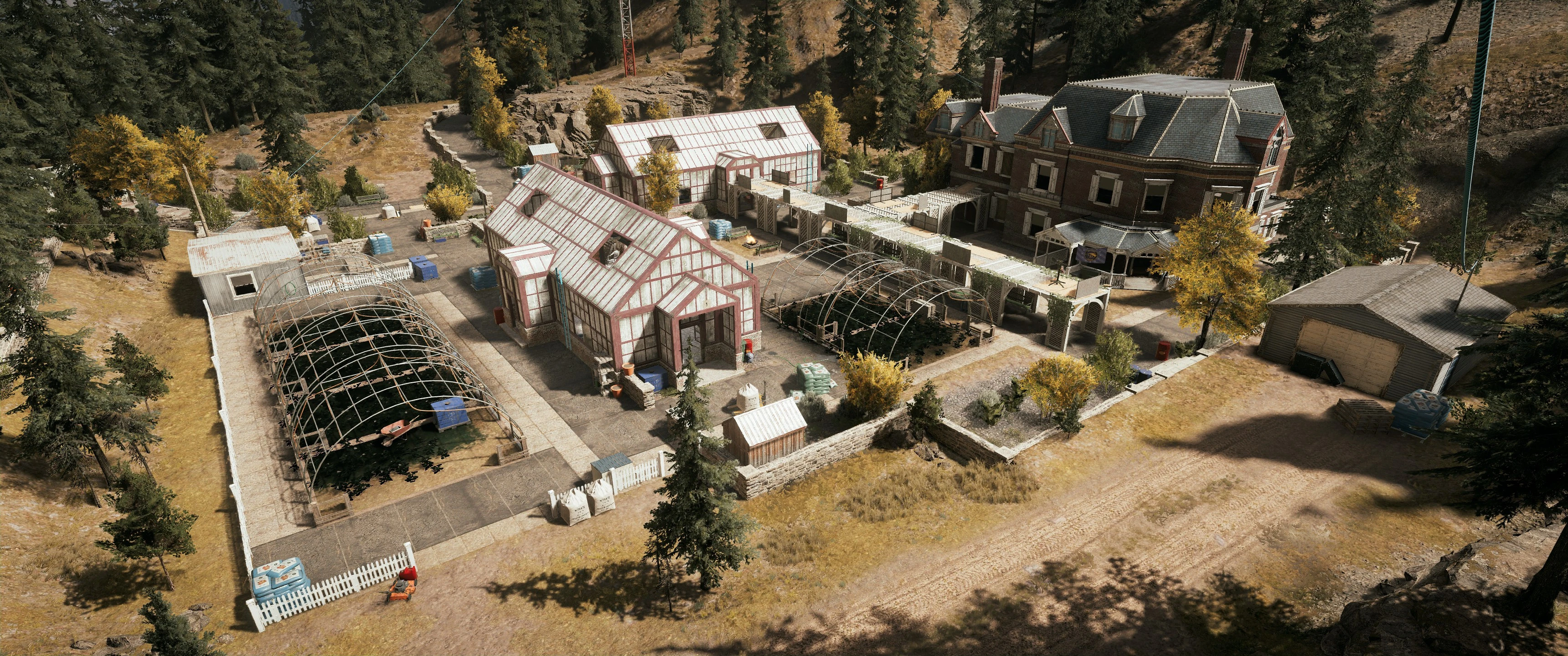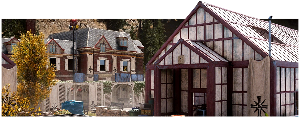 The Jessop Conservatory is an outpost located in the Henbane River region of Hope County in Far Cry 5. The conservatory itself is part of a larger estate that once belonged to the Jessop family, until the property was turned over to Joseph Seed and his family by its former owner, Dr. Rachel Jessop. Both the Georgian-style mansion and the adjacent atrium facilities have been converted to a research facility for the purpose of developing and cultivating useful plants, particularly the nightshade strain that provides the crucial ingredient of Eden's Gate's dissociative, Bliss, which is supplied as a powder and in a liquid form, under the direction of a cult-affiliated local pharmacist by the name of Feeney.