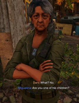 Miguelina is a supporting character in Far Cry 6. She is a living legend among the Legends of 67 as they rallied around the communist professor Santos Espinosa to overthrow Gabriel Castillo, the president of Yara. She is the first love of Lorenzo Canseco and a veteran of the Revolution of 1967.