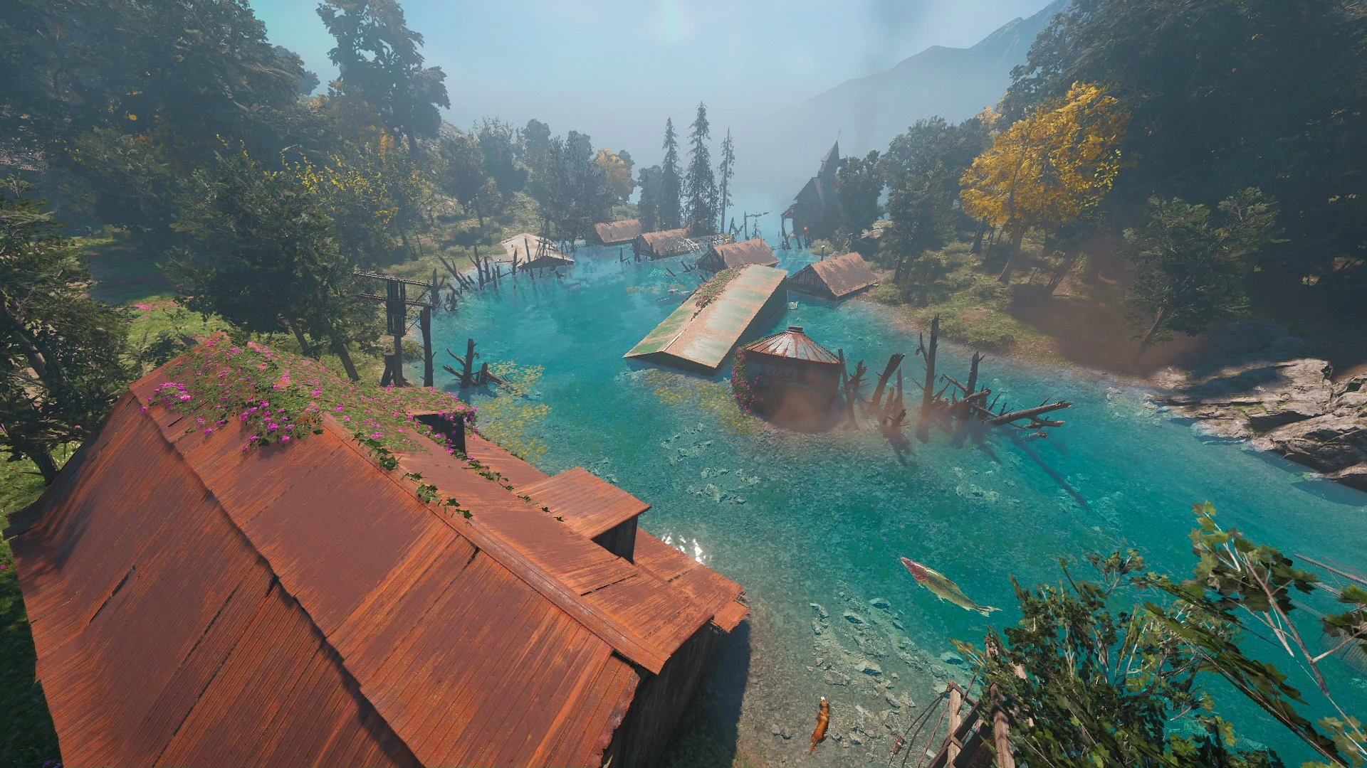 Joseph Seed's former compound is in a bad shape after the Collapse. Despite being in the middle of a flaming inferno, most buildings survived initially, but the Silver Lakes waterlevels rose and flooded them.